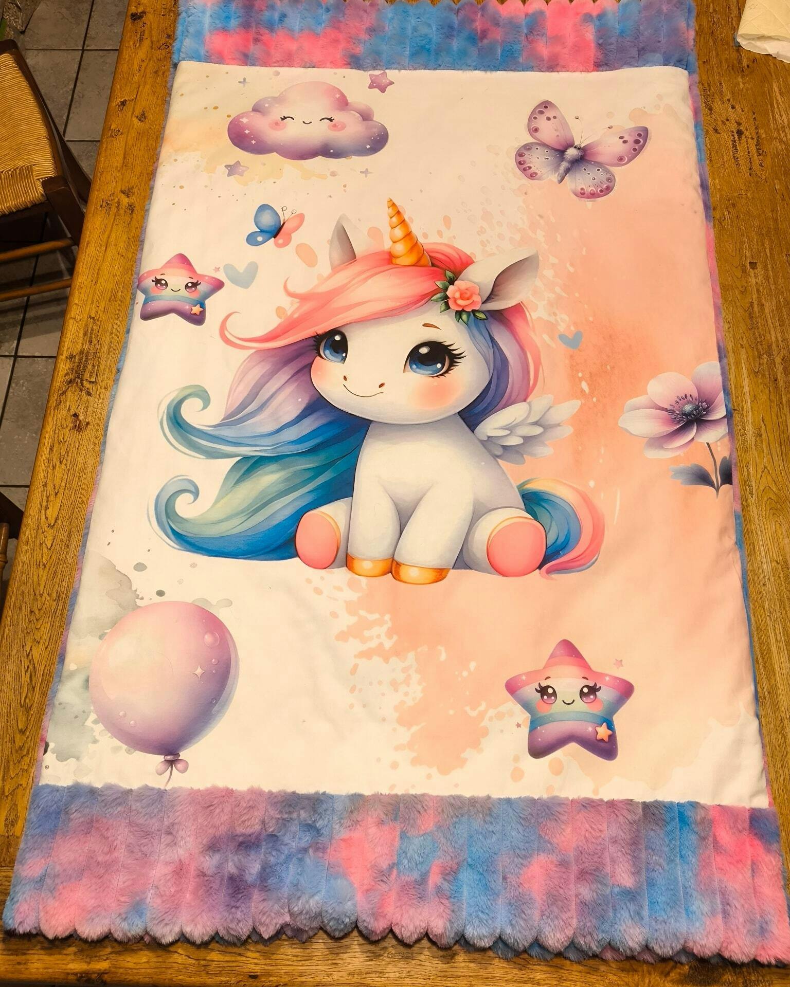 ☛ Description : Licorne aux crins multicolores avec corne dorée et ailes blanches, accompagnée de papillons bleus et violets. Fleurs roses et violettes sur fond dégradé rose et blanc avec éclaboussures.