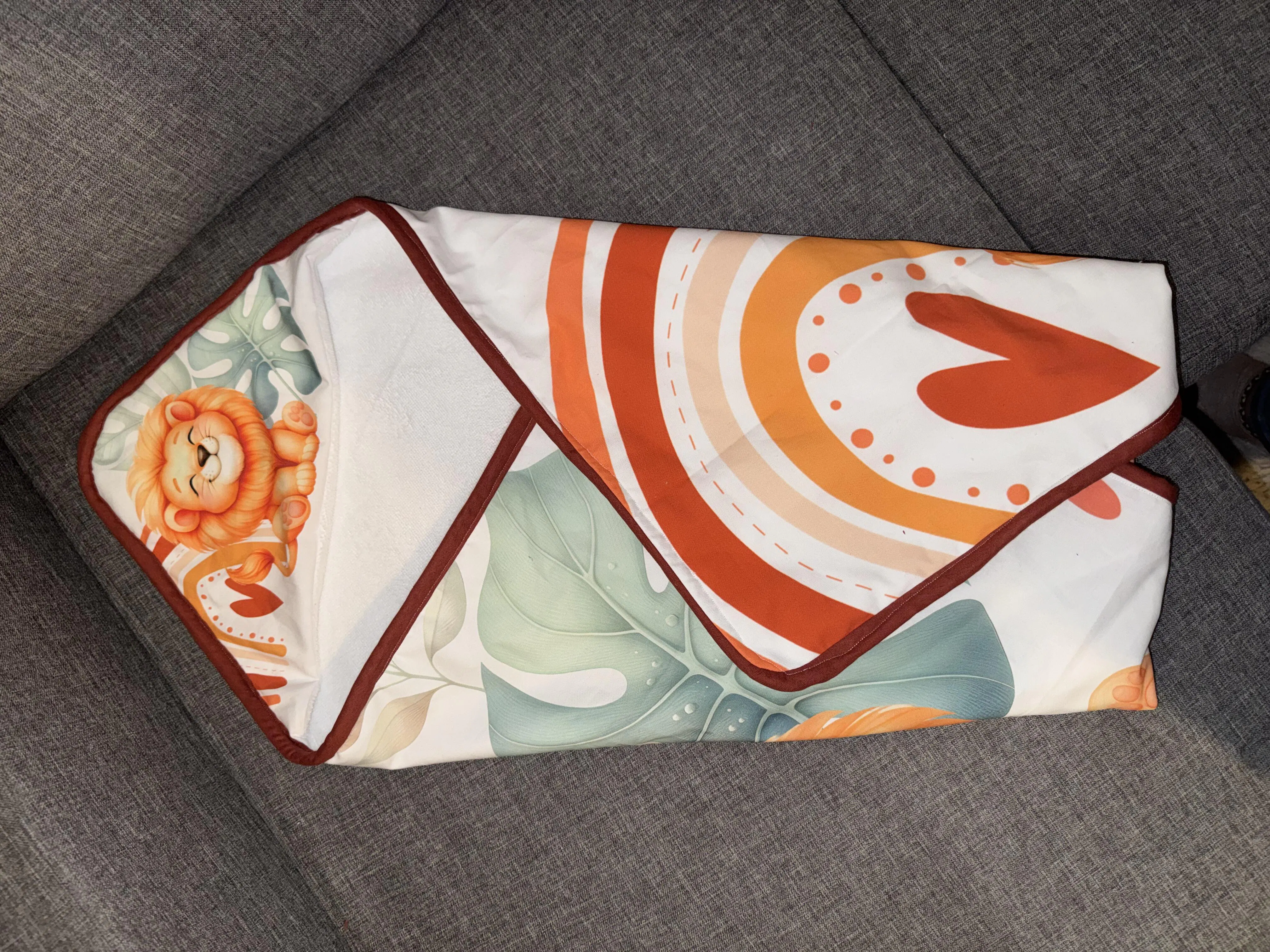 ☛ Description : Lion souriant orange avec feuilles vertes et arc-en-ciel brun sur fond blanc. Cœur brun et points rouges complètent le motif.