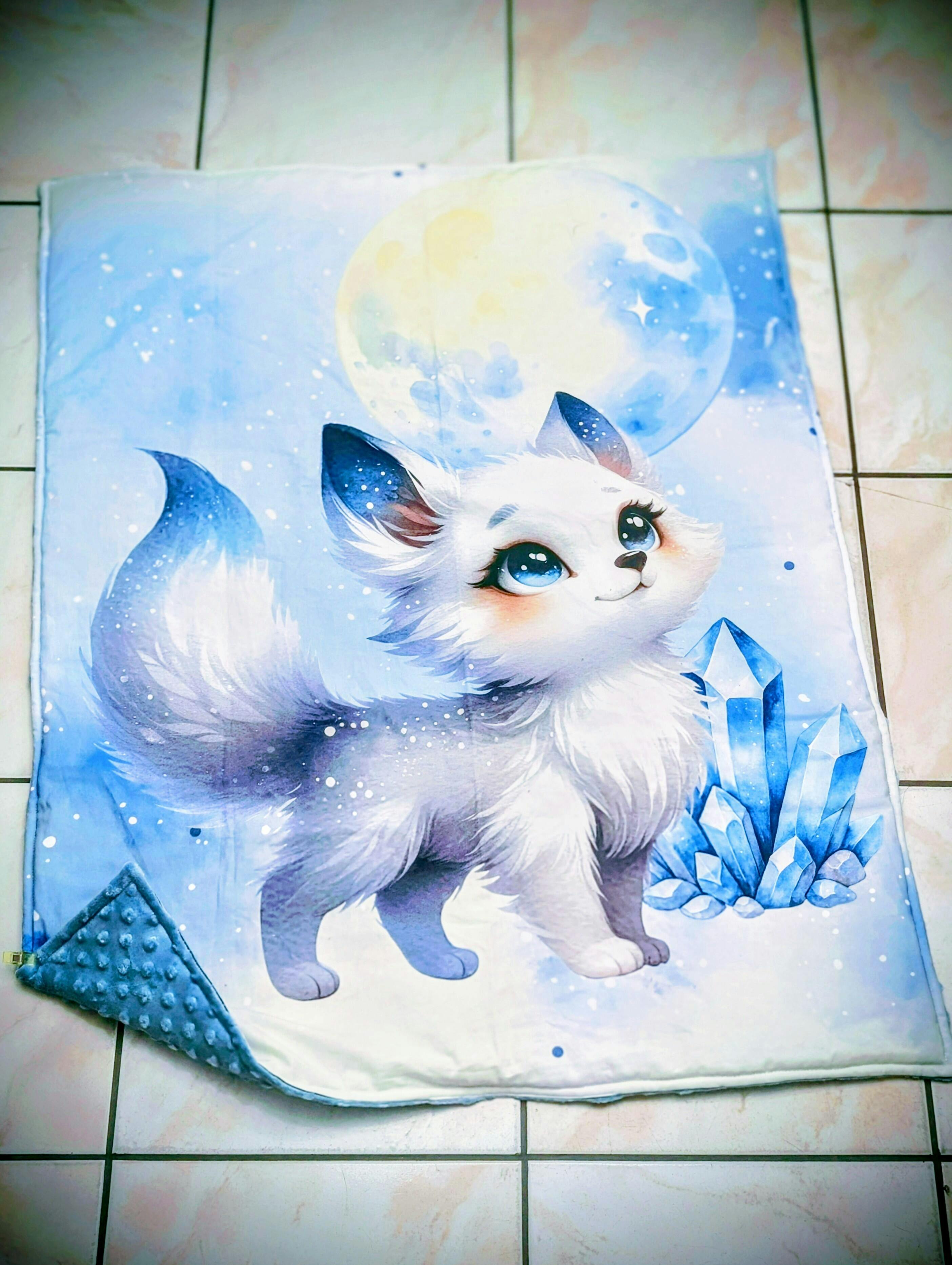 ☛ Description : Renard aux yeux bleus et cristaux bleus avec lune jaune sur fond bleu clair avec étoiles blanches.