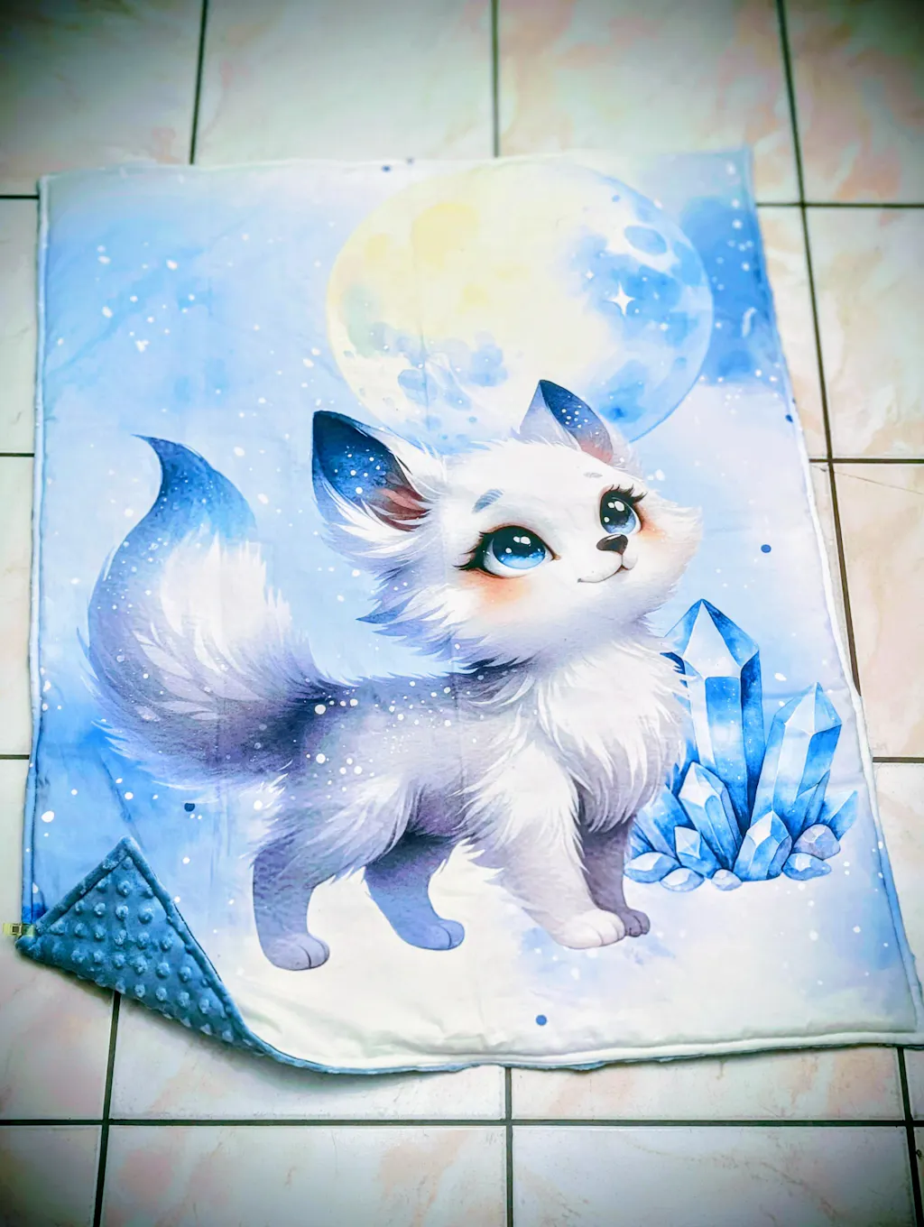 ☛ Description : Renard aux yeux bleus et cristaux bleus avec lune jaune sur fond bleu clair avec étoiles blanches.